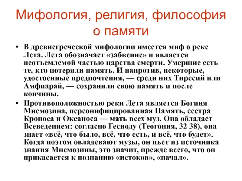 Противоположностью реки Лета является Богиня Мнемозина, персонифицированная Память, сестра Кроноса и Океаноса — мать всех муз. Она обладает Всеведением: согласно Гесиоду (Теогония, 32 38), она знает «всё, что было, всё, что есть, и всё, что будет». Когда поэтом овладевают музы, он пьет из источника знания Мнемозины, это значит, прежде всего, что он прикасается к познанию «истоков», «начал».