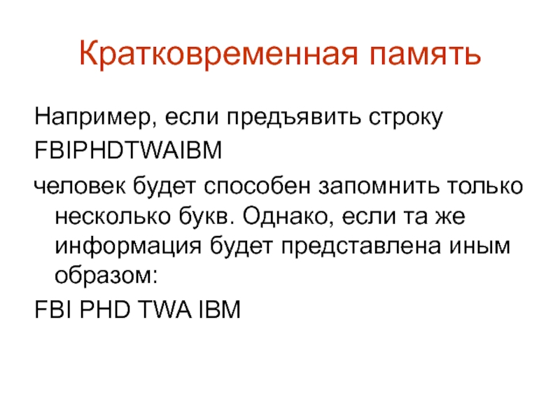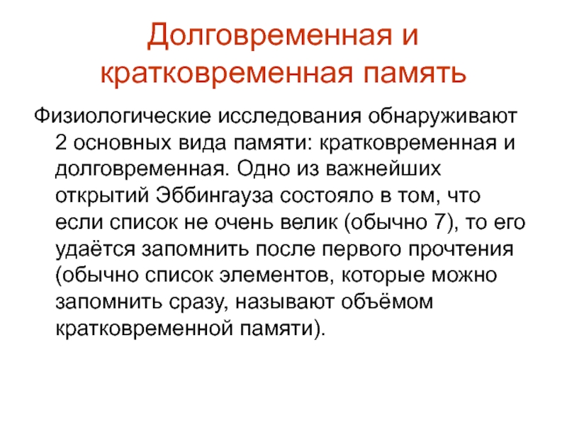 и долговременная. Одно из важнейших открытий Эббингауза состояло в том, что если список не очень велик (обычно 7), то его удаётся запомнить после первого прочтения (обычно список элементов, которые можно запомнить сразу, называют объёмом кратковременной памяти).