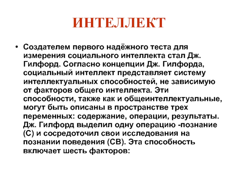 Согласно концепции Дж. Гилфорда, социальный интеллект представляет систему интеллектуальных способностей, не зависимую от факторов общего интеллекта. Эти способности, также как и общеинтеллектуальные, могут быть описаны в пространстве трех переменных: содержание, операции, результаты. Дж. Гилфорд выделил одну операцию -познание (С) и сосредоточил свои исследования на познании поведения (СВ). Эта способность включает шесть факторов: