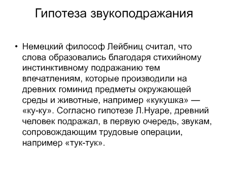 Немецкий философ Лейбниц считал, что слова образовались благодаря стихийному инстинктивному