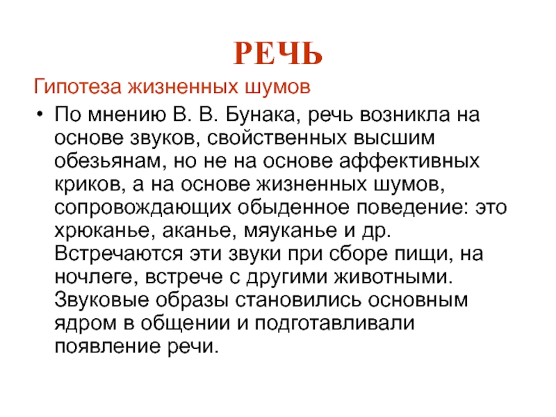 звуков, свойственных высшим обезьянам, но не на основе аффективных криков, а на основе жизненных шумов, сопровождающих обыденное поведение: это хрюканье, аканье, мяуканье и др. Встречаются эти звуки при сборе пищи, на ночлеге, встрече с другими животными. Звуковые образы становились основным ядром в общении и подготавливали появление речи.