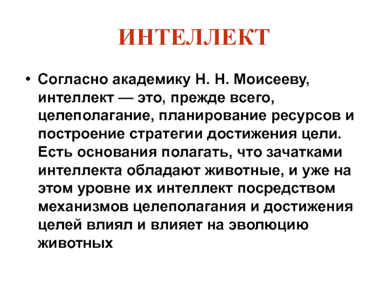 Согласно академику Н. Н. Моисееву, интеллект — это, прежде всего, целеполагание,