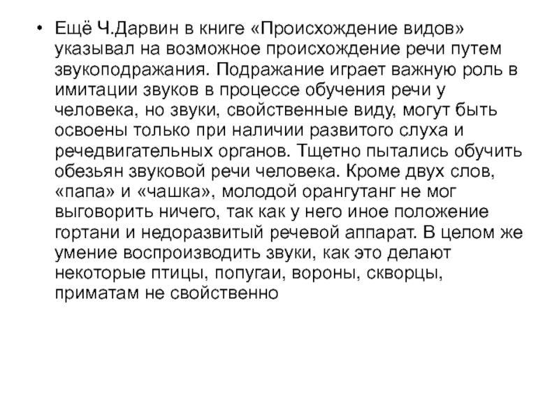 Ещё Ч.Дарвин в книге «Происхождение видов» указывал на возможное происхождение речи