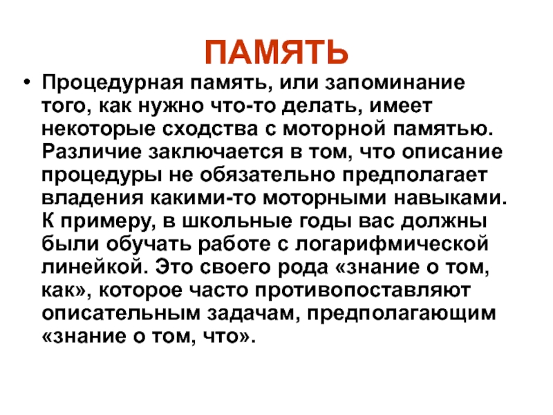 сходства с моторной памятью. Различие заключается в том, что описание процедуры не обязательно предполагает владения какими-то моторными навыками. К примеру, в школьные годы вас должны были обучать работе с логарифмической линейкой. Это своего рода «знание о том, как», которое часто противопоставляют описательным задачам, предполагающим «знание о том, что».