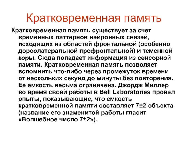 из областей фронтальной (особенно дорсолатеральной префронтальной) и теменной коры. Сюда попадает информация из сенсорной памяти. Кратковременная память позволяет вспомнить что-либо через промежуток времени от нескольких секунд до минуты без повторения. Ее емкость весьма ограничена. Джордж Миллер во время своей работы в Bell Laboratories провел опыты, показывающие, что емкость кратковременной памяти составляет 7±2 объекта (название его знаменитой работы гласит «Волшебное число 7±2»).