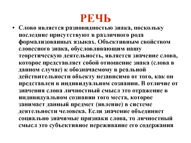 языках. Объективным свойством словесного знака, обусловливающим нашу теоретическую деятельность, является значение слова, которое представляет собой отношение знака (слова в данном случае) к обозначаемому в реальной действительности объекту независимо от того, как он представлен в индивидуальном сознании. В отличие от значения слова личностный смысл это отражение в индивидуальном сознании того места, которое занимает данный предмет (явление) в системе деятельности человека. Если значение объединяет социально значимые признаки слова, то личностный смысл это субъективное переживание его содержания