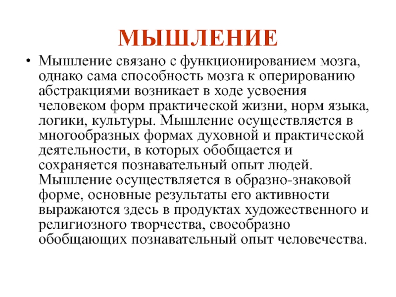 абстракциями возникает в ходе усвоения человеком форм практической жизни, норм языка, логики, культуры. Мышление осуществляется в многообразных формах духовной и практической деятельности, в которых обобщается и сохраняется познавательный опыт людей. Мышление осуществляется в образно-знаковой форме, основные результаты его активности выражаются здесь в продуктах художественного и религиозного творчества, своеобразно обобщающих познавательный опыт человечества.