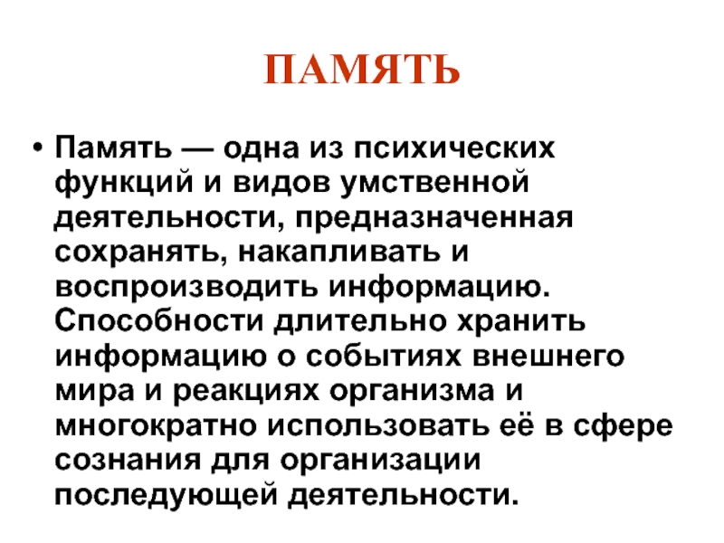 сохранять, накапливать и воспроизводить информацию. Способности длительно хранить информацию о событиях внешнего мира и реакциях организма и многократно использовать её в сфере сознания для организации последующей деятельности.