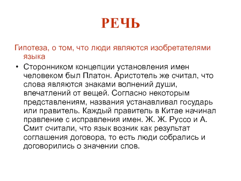 человеком был Платон. Аристотель же считал, что слова являются знаками волнений души, впечатлений от вещей. Согласно некоторым представлениям, названия устанавливал государь или правитель. Каждый правитель в Китае начинал правление с исправления имен. Ж. Ж. Руссо и А. Смит считали, что язык возник как результат соглашения договора, то есть люди собрались и договорились о значении слов.
