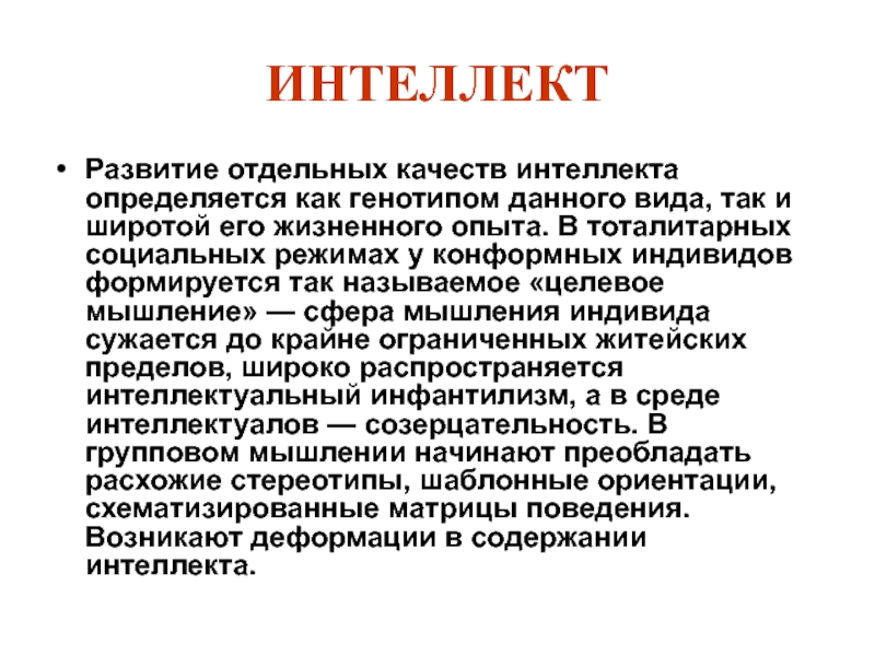 широтой его жизненного опыта. В тоталитарных социальных режимах у конформных индивидов формируется так называемое «целевое мышление» — сфера мышления индивида сужается до крайне ограниченных житейских пределов, широко распространяется интеллектуальный инфантилизм, а в среде интеллектуалов — созерцательность. В групповом мышлении начинают преобладать расхожие стереотипы, шаблонные ориентации, схематизированные матрицы поведения. Возникают деформации в содержании интеллекта.