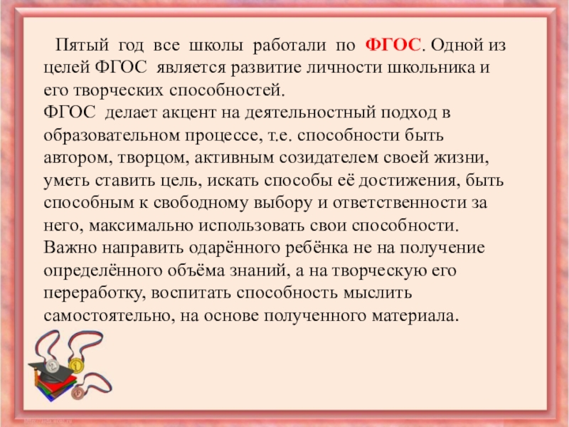 ФГОС делает акцент на деятельностный подход в образовательном процессе, т.е. способности быть автором, творцом, активным созидателем своей жизни, уметь ставить цель, искать способы её достижения, быть способным к свободному выбору и ответственности за него, максимально использовать свои способности. Важно направить одарённого ребёнка не на получение определённого объёма знаний, а на творческую его переработку, воспитать способность мыслить самостоятельно, на основе полученного материала.