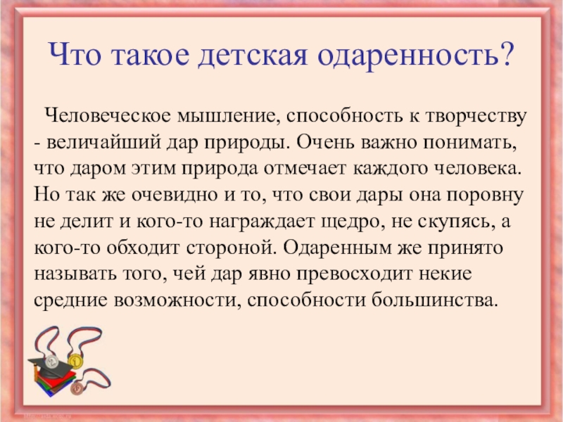 дар природы. Очень важно понимать, что даром этим природа отмечает каждого человека. Но так же очевидно и то, что свои дары она поровну не делит и кого-то награждает щедро, не скупясь, а кого-то обходит стороной. Одаренным же принято называть того, чей дар явно превосходит некие средние возможности, способности большинства.