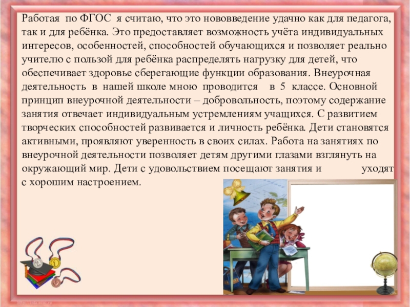 педагога, так и для ребёнка. Это предоставляет возможность учёта индивидуальных интересов, особенностей, способностей обучающихся и позволяет реально учителю с пользой для ребёнка распределять нагрузку для детей, что обеспечивает здоровье сберегающие функции образования. Внеурочная деятельность в нашей школе мною проводится в 5 классе. Основной принцип внеурочной деятельности – добровольность, поэтому содержание занятия отвечает индивидуальным устремлениям учащихся. С развитием творческих способностей развивается и личность ребёнка. Дети становятся активными, проявляют уверенность в своих силах. Работа на занятиях по внеурочной деятельности позволяет детям другими глазами взглянуть на окружающий мир. Дети с удовольствием посещают занятия и уходят с хорошим настроением.
