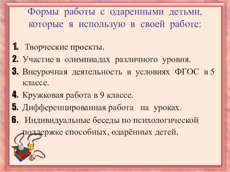 Слайд 6Формы работы с одаренными детьми, которые я использую в своей работе: