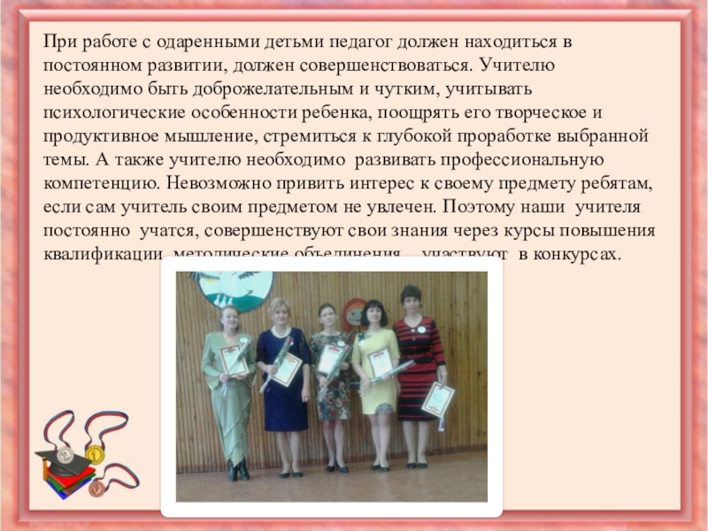 Слайд 20При работе с одаренными детьми педагог должен находиться в постоянном развитии,