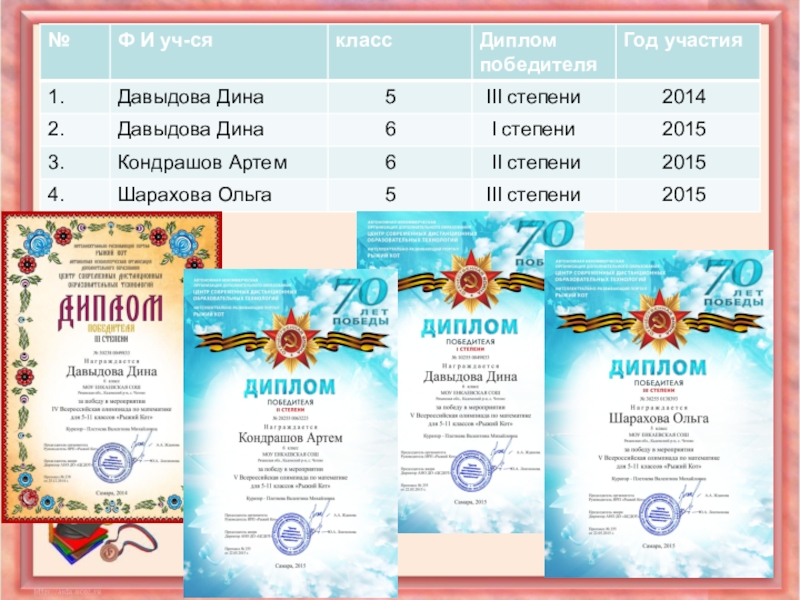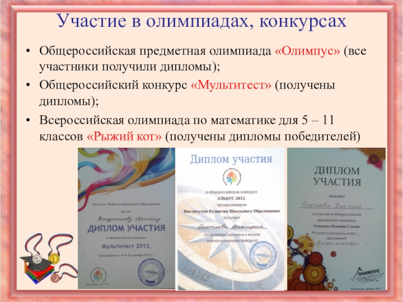 Всероссийская олимпиада по математике для 5 – 11 классов «Рыжий кот» (получены дипломы победителей)