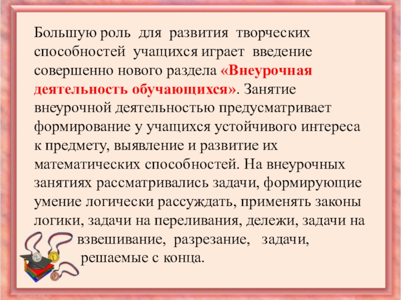 раздела «Внеурочная деятельность обучающихся». Занятие внеурочной деятельностью предусматривает формирование у учащихся устойчивого интереса к предмету, выявление и развитие их математических способностей. На внеурочных занятиях рассматривались задачи, формирующие умение логически рассуждать, применять законы логики, задачи на переливания, дележи, задачи на