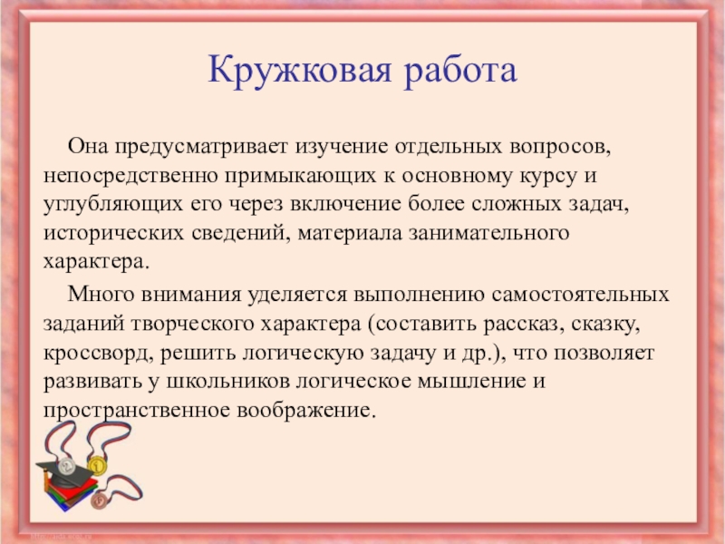 Много внимания уделяется выполнению самостоятельных заданий творческого характера (составить рассказ, сказку, кроссворд, решить логическую задачу и др.), что позволяет развивать у школьников логическое мышление и пространственное воображение.
