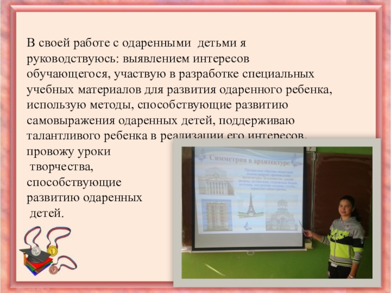 обучающегося, участвую в разработке специальных учебных материалов для развития одаренного ребенка, использую методы, способствующие развитию самовыражения одаренных детей, поддерживаю талантливого ребенка в реализации его интересов, провожу уроки