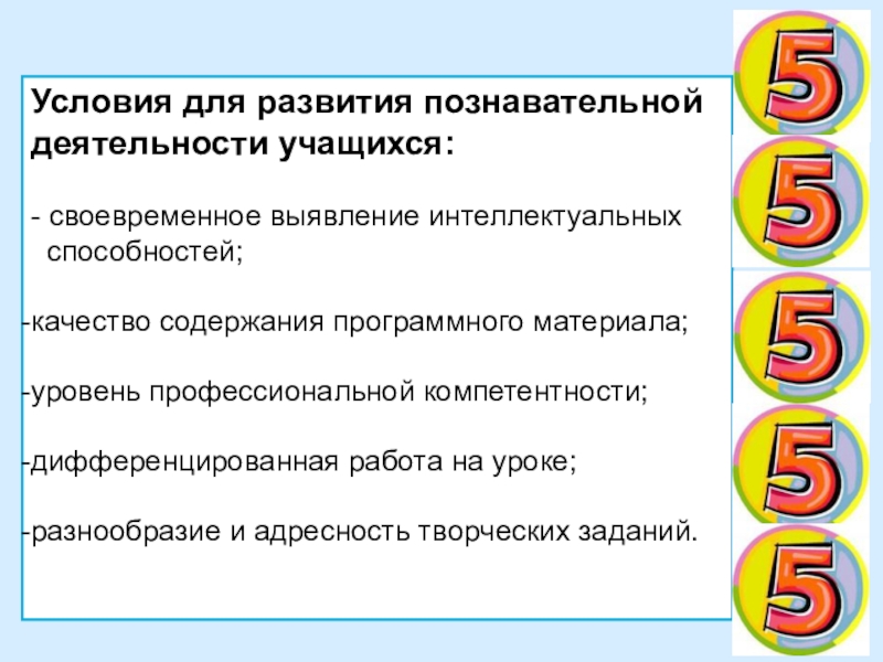 Условия для развития познавательной деятельности учащихся: - своевременное выявление интеллектуальных  способностей;качество содержания программного материала;уровень профессиональной компетентности;