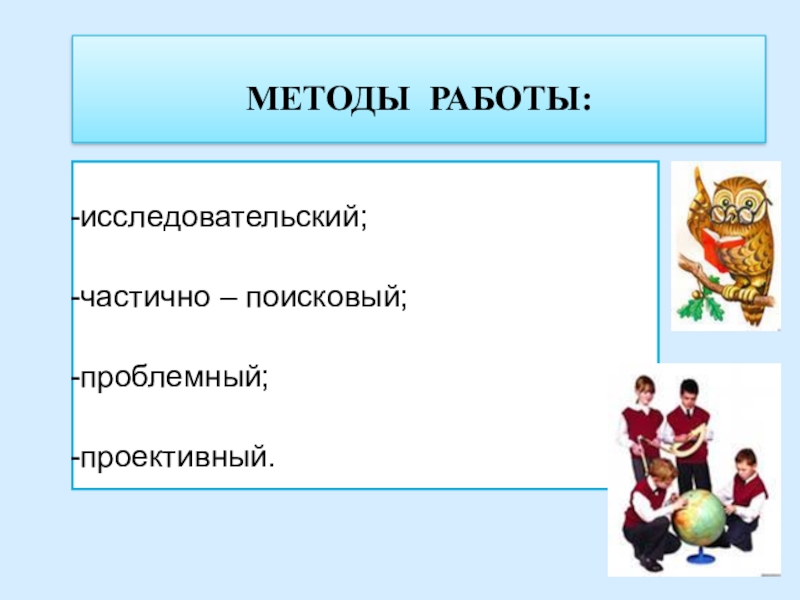 МЕТОДЫ РАБОТЫ:исследовательский; частично – поисковый; проблемный; проективный.