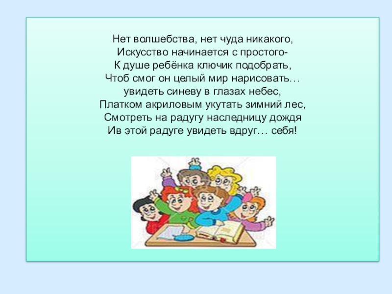Слайд 11 Нет волшебства, нет чуда никакого, Искусство начинается с простого- К душе ребёнка ключик