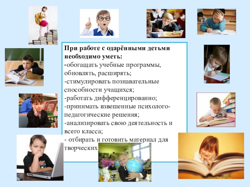 При работе с одарёнными детьми необходимо уметь:-обогащать учебные программы, обновлять, расширять;-стимулировать познавательные способности учащихся;-работать дифференцированно;-принимать взвешенные психолого-педагогические