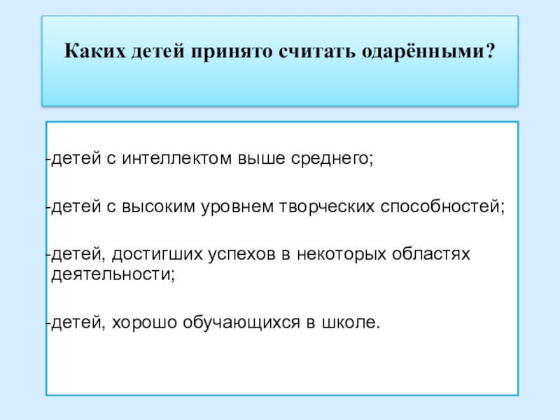 Каких детей принято считать одарёнными?детей с интеллектом выше среднего; детей с высоким уровнем творческих способностей; детей,