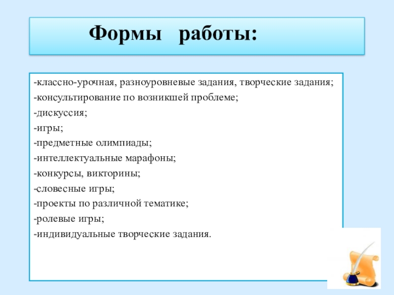 Формы  работы:-классно-урочная, разноуровневые задания, творческие задания;-консультирование по возникшей проблеме;-дискуссия;