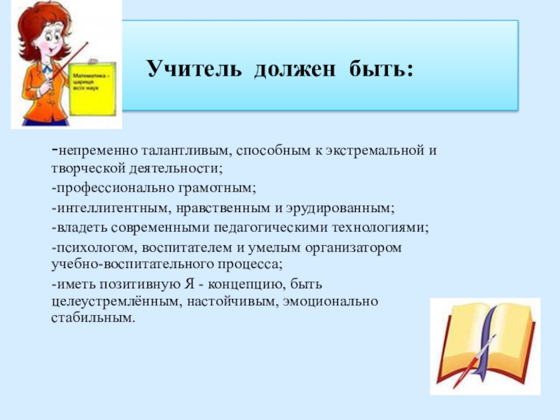 Учитель должен быть:-непременно талантливым, способным к экстремальной и творческой деятельности;-профессионально грамотным;-интеллигентным, нравственным и эрудированным;-владеть современными педагогическими