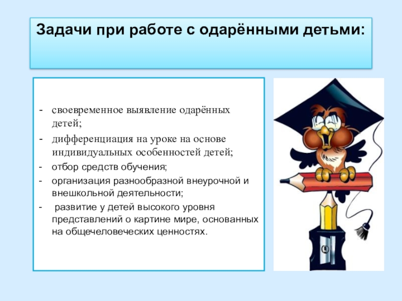 Слайд 5Задачи при работе с одарёнными детьми: