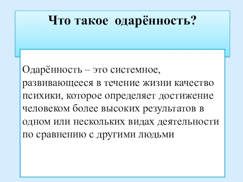 Что такое одарённость?Одарённость – это системное, развивающееся в течение жизни качество психики, которое определяет достижение человеком более