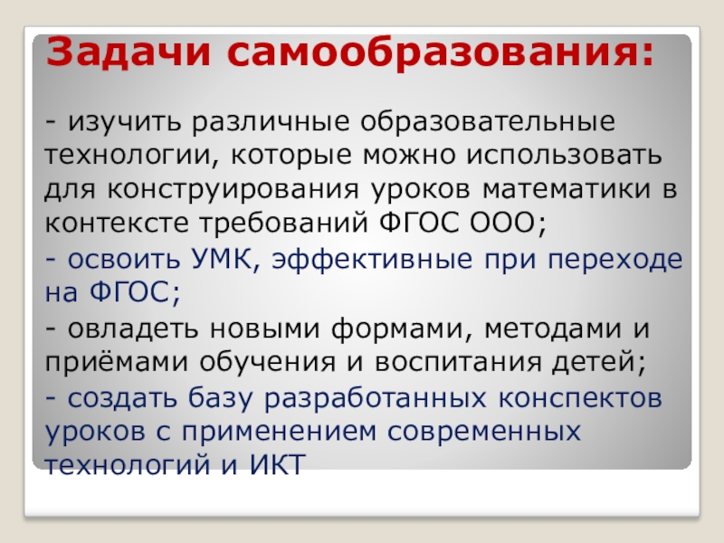 Задачи самообразования:- изучить различные образовательные  технологии, которые можно использовать для конструирования уроков математики в контексте требований