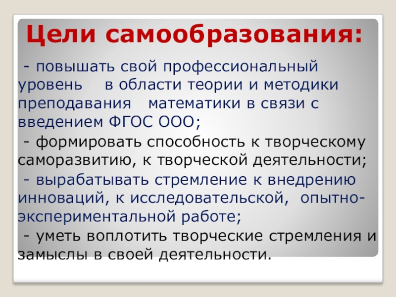 Цели самообразования: - повышать свой профессиональный уровень  в области теории и методики преподавания  математики в