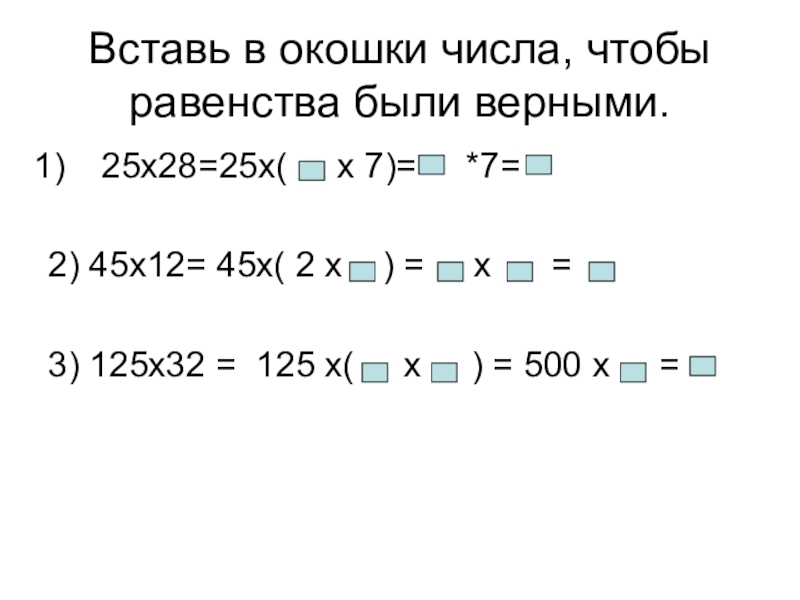 Вставь в окошки числа, чтобы равенства были верными.25х28=25х( х 7)= *7= 2) 45х12= 45х( 2 х ) = х =