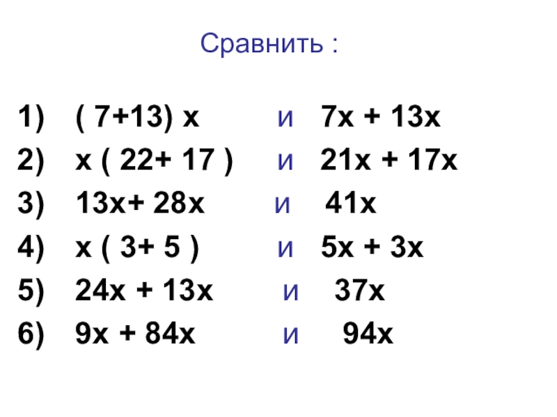 Сравнить : ( 7+13) х     и  7х + 13х х ( 22+