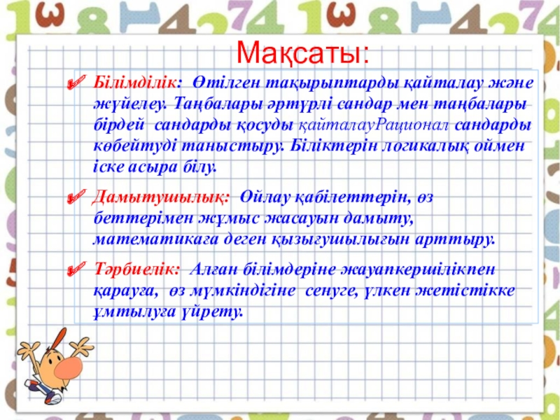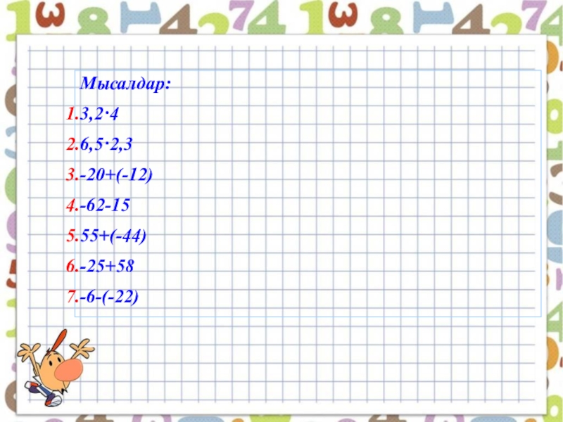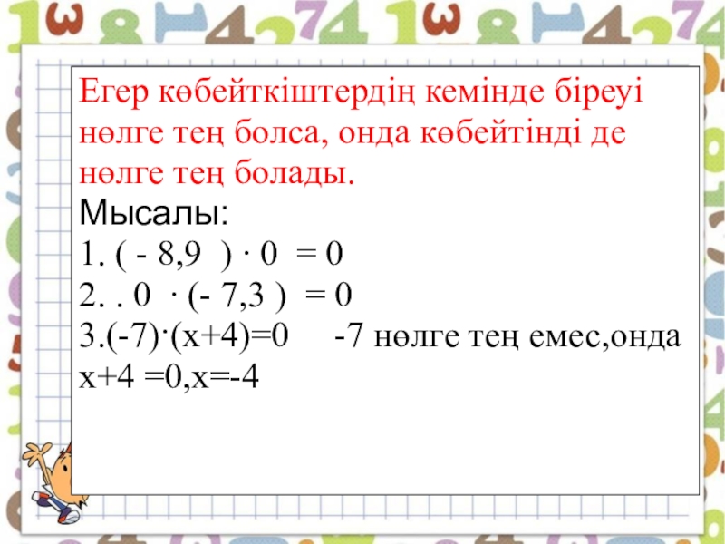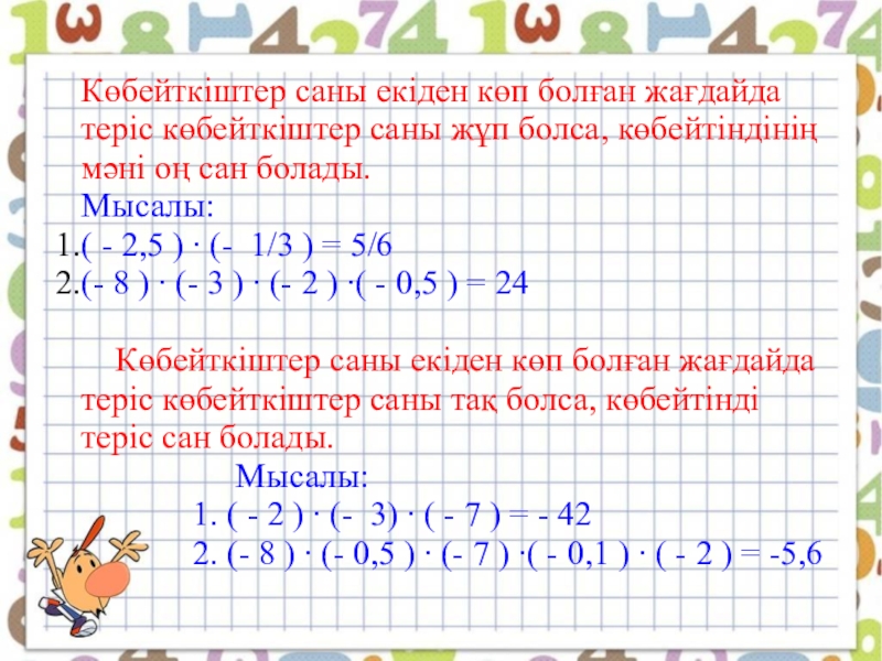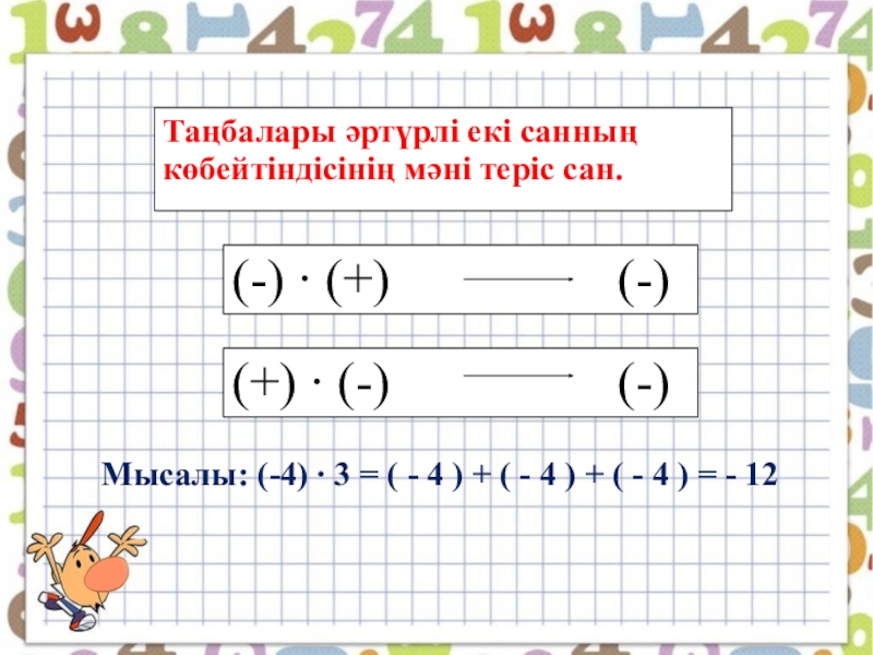 Мысалы: (-4) ∙ 3 = ( - 4 ) + ( - 4 ) + ( - 4 ) = - 12