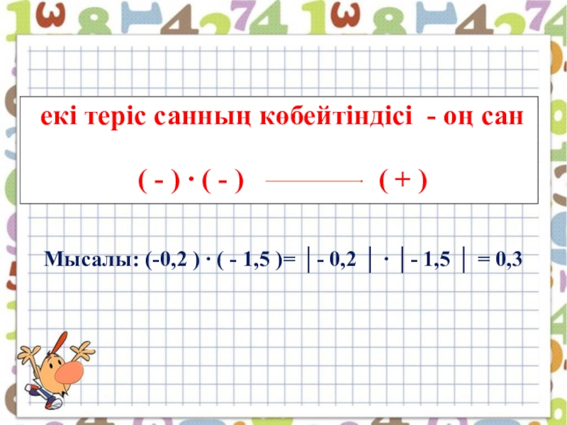 Мысалы: (-0,2 ) ∙ ( - 1,5 )= │- 0,2 │ ∙ │- 1,5 │ = 0,3