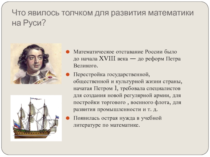 Слайд 14Что явилось толчком для развития математики на Руси?
