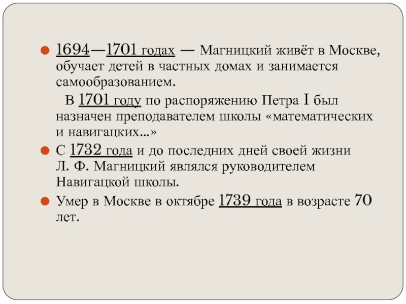 Слайд 191694—1701 годах — Магницкий живёт в Москве, обучает детей в частных домах