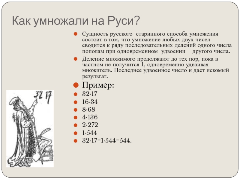 что умножение любых двух чисел сводится к ряду последовательных делений одного числа пополам при одновременном удвоении другого числа.