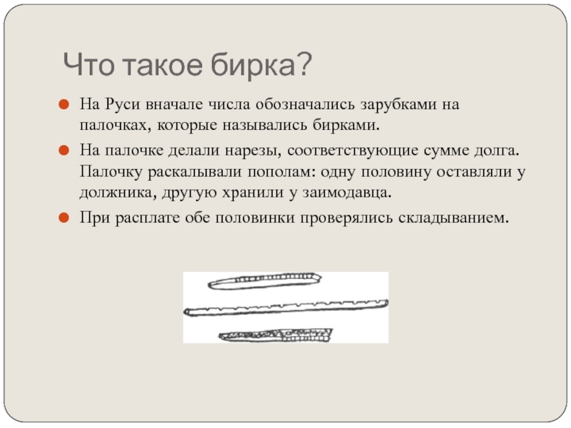 На палочке делали нарезы, соответствующие сумме долга. Палочку раскалывали пополам: одну половину оставляли у должника, другую хранили у заимодавца.