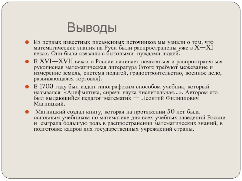 «Арифметика…» Магницкого сыграла большую роль в распространении математических знаний, в подготовке кадров для государственных учреждений страны.
