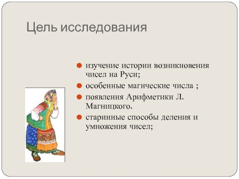 Мы думаем, что числа на Руси появились очень давно, еще до нашей эры. Чисел вначале было немного, но потом стали появляться новые числа, потому что маленьких чисел стало не хватать с развитием сельского хозяйства. Но арифметика, как наука, возникла не так давно –несколько веков назад.