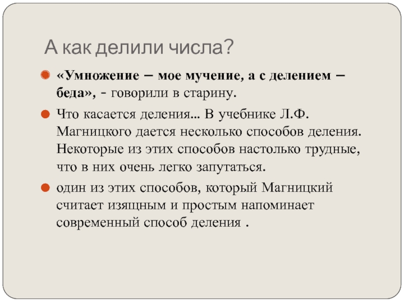 один из этих способов, который Магницкий считает изящным и простым напоминает современный способ деления .