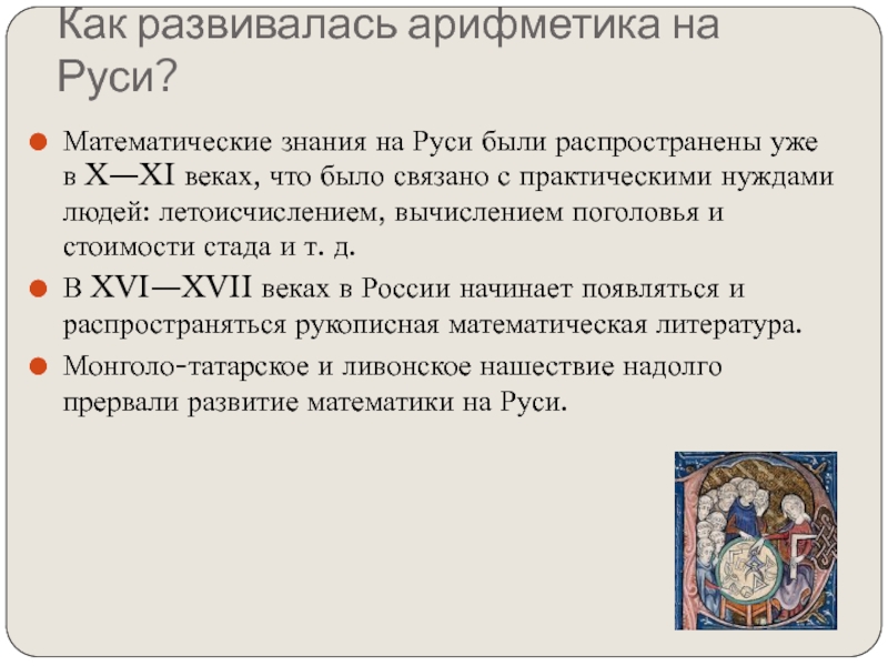 источников мы узнали о том, что математические знания на Руси были распространены уже в X—XI веках. Они были связаны с бытовыми нуждами людей.