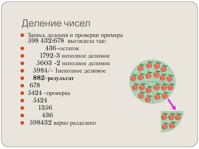 Запись деления и проверки примера 598 432:678 выглядела так: