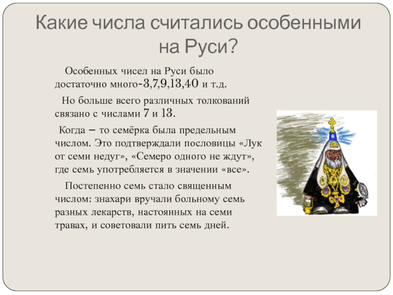 Постепенно семь стало священным числом: знахари вручали больному семь разных лекарств, настоянных на семи травах, и советовали пить семь дней.