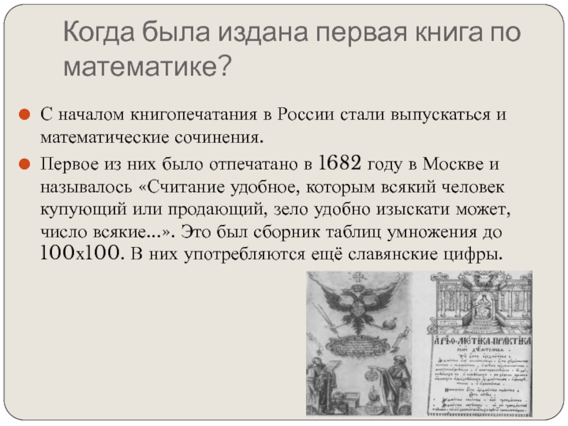 Первое из них было отпечатано в 1682 году в Москве и называлось «Считание удобное, которым всякий человек купующий или продающий, зело удобно изыскати может, число всякие...». Это был сборник таблиц умножения до 100х100. В них употребляются ещё славянские цифры.