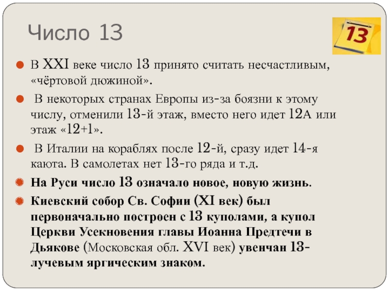 В XXI веке число 13 принято считать несчастливым, «чёртовой дюжиной».